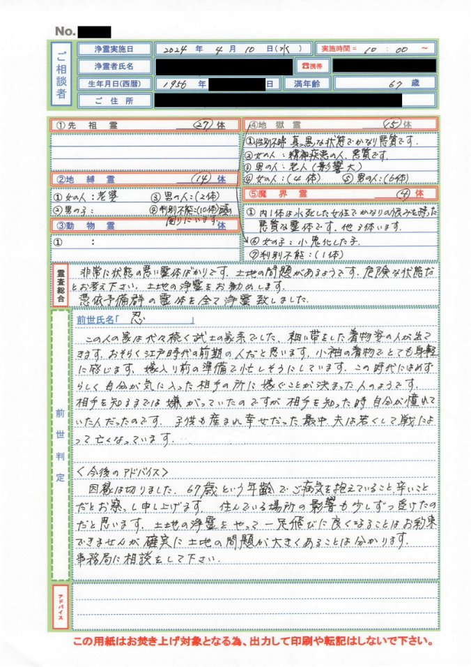 完全浄霊プラスが完了しましたら、下記のような完全浄霊プラス結果シートをお送りいたします。